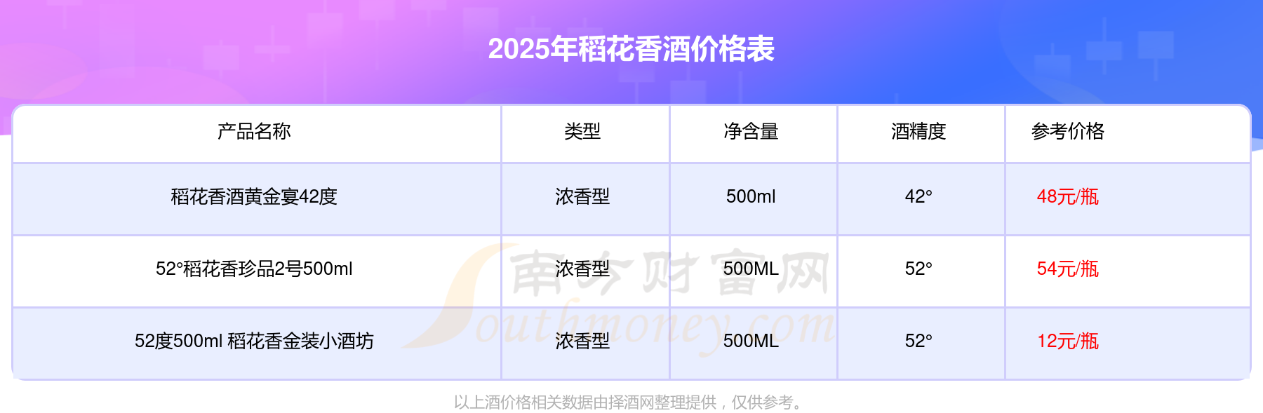2025年,52°稻花香珍品2號500ml、稻花香酒黃金宴42度、52度500ml 稻花香金裝小酒坊等稻花香酒價格如下:52°稻花香珍品2號500ml參考價54元/瓶、稻花香酒黃金宴42度參考價48元/瓶、52度500ml 稻花香金裝小酒坊參考價12元/瓶。