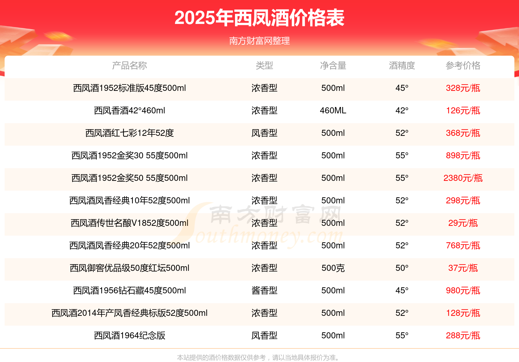 西鳳酒最新價(jià)格2025:西鳳酒 酒海私藏55度3000ml參考價(jià)8880元/瓶、西鳳酒1952金獎(jiǎng)50 55度500ml參考價(jià)2380元/瓶、西鳳酒2013年產(chǎn)老酒鳳香經(jīng)典30年52度500ml參考價(jià)1280元/瓶、西鳳酒1956鉆石藏45度500ml參考價(jià)980元/瓶、西鳳酒1952金獎(jiǎng)30 55度500ml參考價(jià)898元/瓶、西鳳酒鳳香經(jīng)典20年52度500ml參考價(jià)768元/瓶、西鳳酒1952金獎(jiǎng)30 45度500ml參考價(jià)658元/瓶、西鳳酒1956紀(jì)念版52度500ml參考價(jià)498元/瓶。