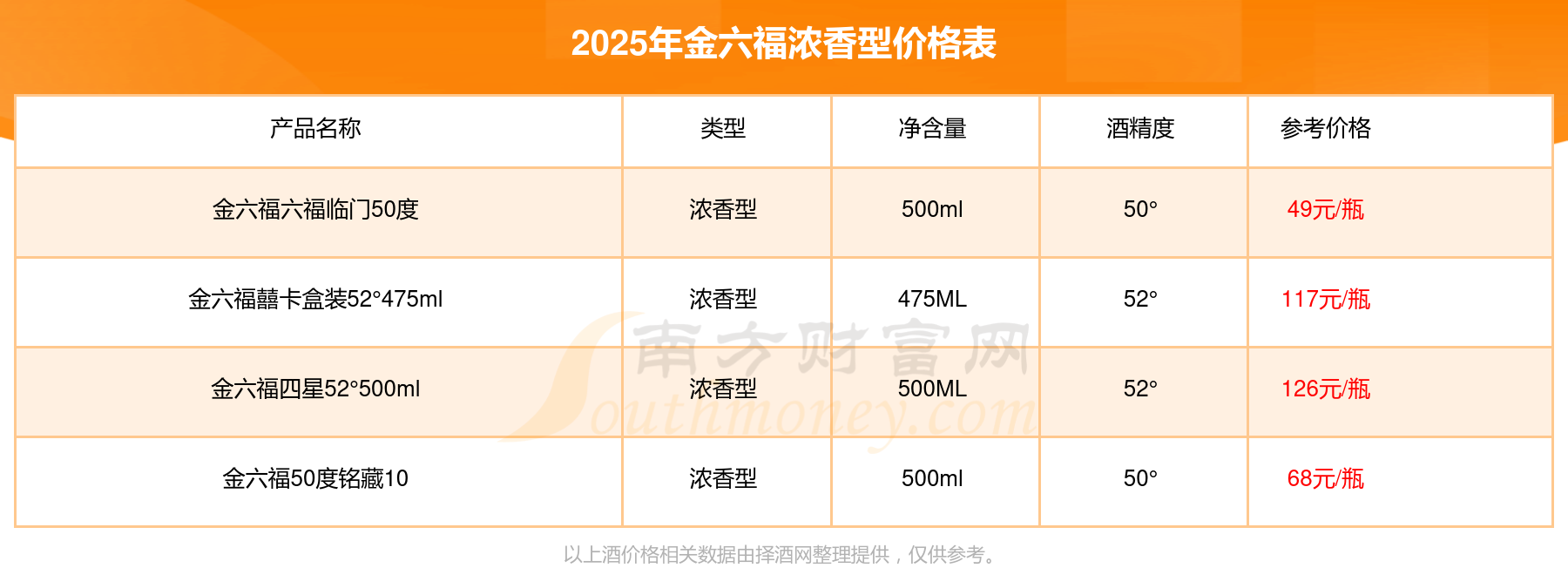 金六福四星52°500ml參考價126元/瓶、金六福囍卡盒裝52°475ml參考價117元/瓶、金六福50度銘藏10參考價68元/瓶、金六福六福臨門50度參考價49元/瓶。