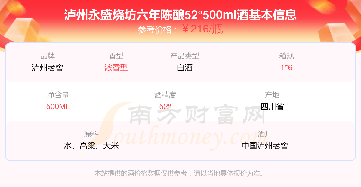 瀘州永盛燒坊六年陳釀52°500ml基本信息