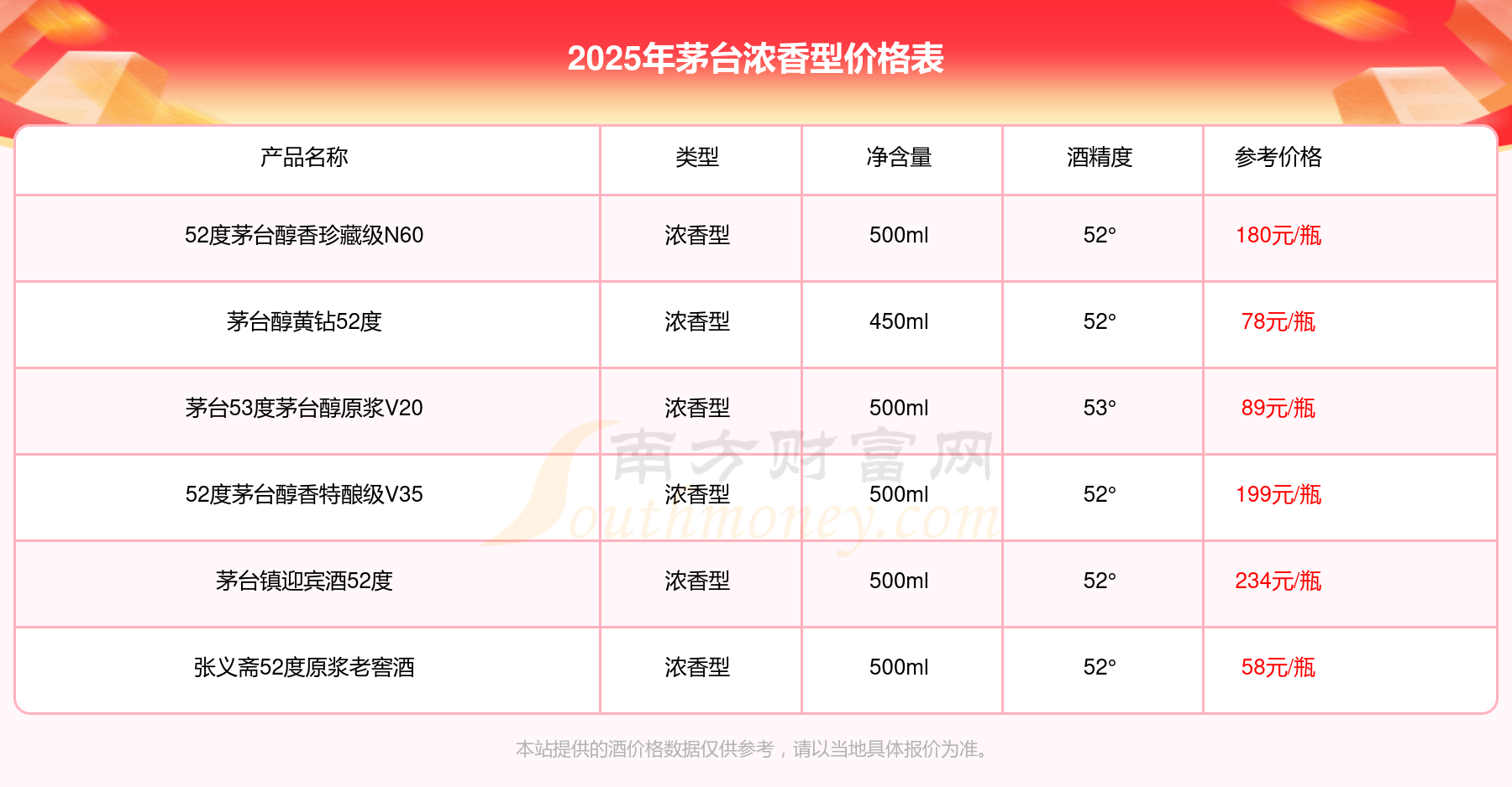 茅臺濃香型酒最新價格2025:茅臺鎮(zhèn)迎賓酒52度參考價234元/瓶、52度茅臺醇香特釀級V35參考價199元/瓶、52度茅臺醇香珍藏級N60參考價180元/瓶、茅臺53度茅臺醇原漿V20參考價89元/瓶、茅臺醇黃鉆52度參考價78元/瓶。