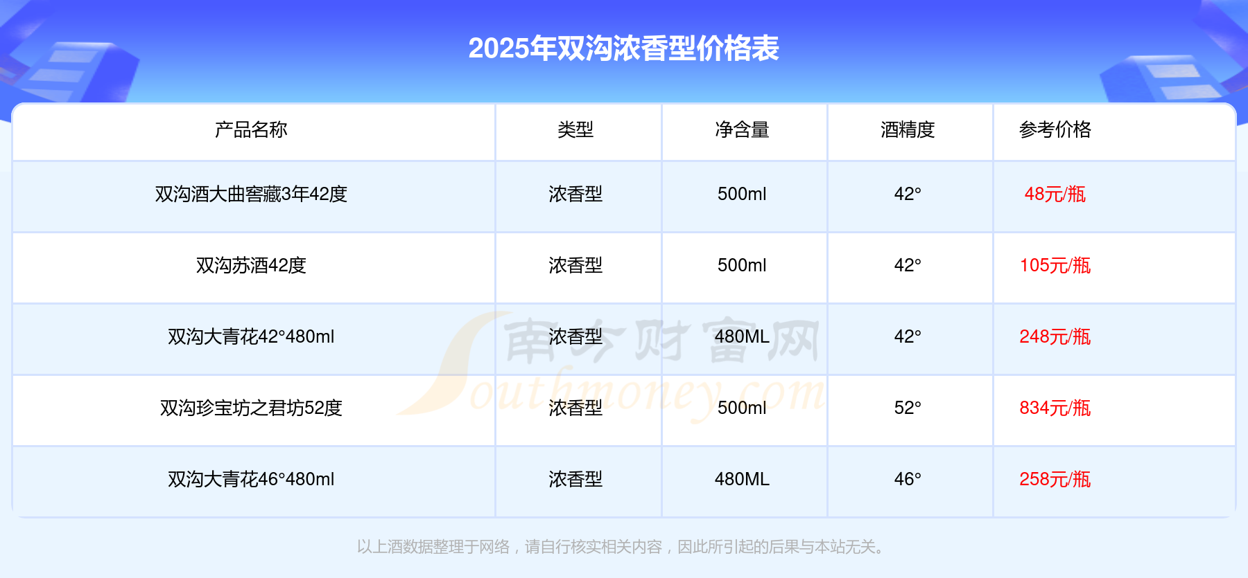 雙溝濃香型酒最新價(jià)格2025:雙溝珍寶坊之君坊52度參考價(jià)834元/瓶、雙溝大青花46°480ml參考價(jià)258元/瓶、雙溝大青花42°480ml參考價(jià)248元/瓶、雙溝蘇酒42度參考價(jià)105元/瓶。