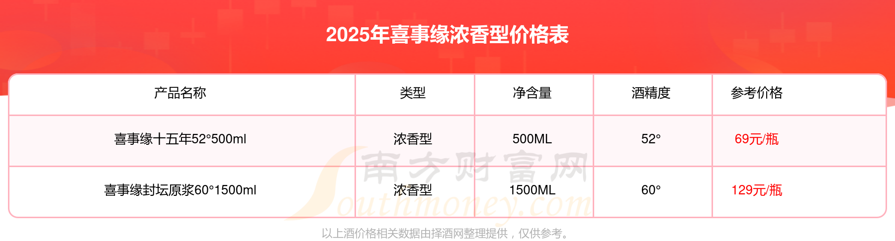 2025年,喜事緣封壇原漿60°1500ml、喜事緣十五年52°500ml等喜事緣濃香型酒價(jià)格如下:喜事緣封壇原漿60°1500ml參考價(jià)129元/瓶、喜事緣十五年52°500ml參考價(jià)69元/瓶。