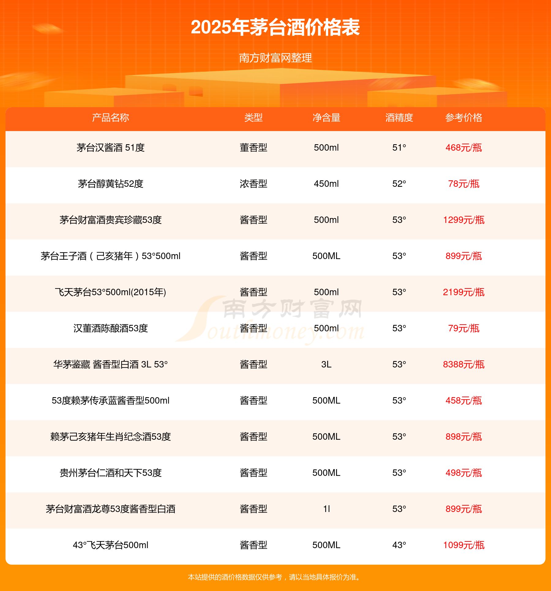 茅臺酒最新價格2025:華茅鑒藏 醬香型白酒 3L 53°參考價8388元/瓶、53度五星茅臺生肖酒丁酉雞年參考價2798元/瓶、貴州茅臺己亥豬年生肖酒53°500ml參考價2699元/瓶。