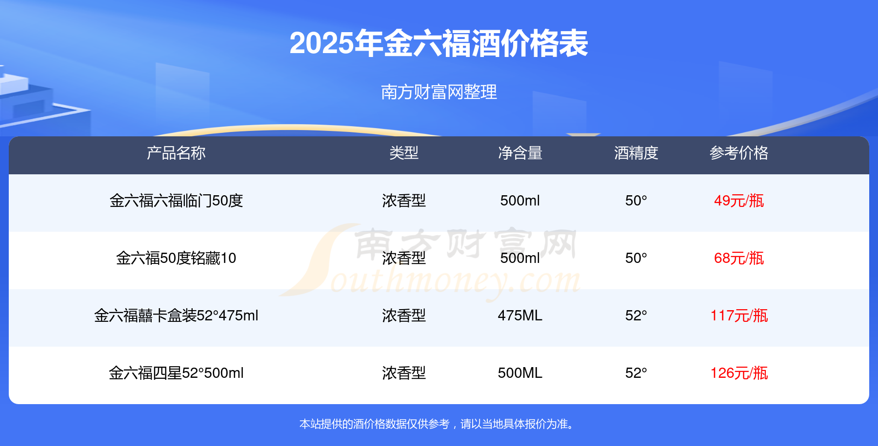 2025年,金六福四星52°500ml、金六福囍卡盒裝52°475ml、金六福50度銘藏10等金六福酒價(jià)格如下:金六福四星52°500ml參考價(jià)126元/瓶、金六福囍卡盒裝52°475ml參考價(jià)117元/瓶、金六福50度銘藏10參考價(jià)68元/瓶。
