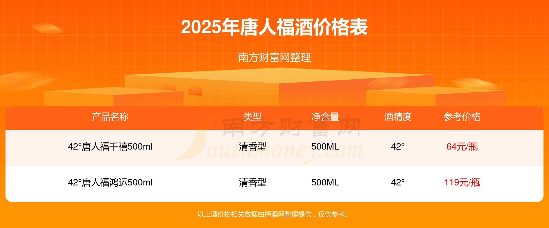42°唐人福鴻運(yùn)500ml參考價(jià)119元/瓶、42°唐人福千禧500ml參考價(jià)64元/瓶。