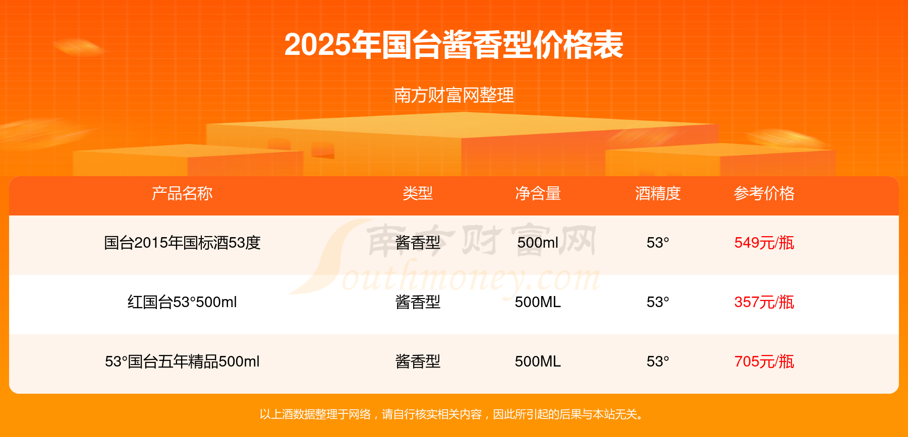 2025國(guó)臺(tái)醬香型酒最新價(jià)格:53°國(guó)臺(tái)五年精品500ml參考價(jià)705元/瓶、國(guó)臺(tái)2015年國(guó)標(biāo)酒53度參考價(jià)549元/瓶、紅國(guó)臺(tái)53°500ml參考價(jià)357元/瓶。