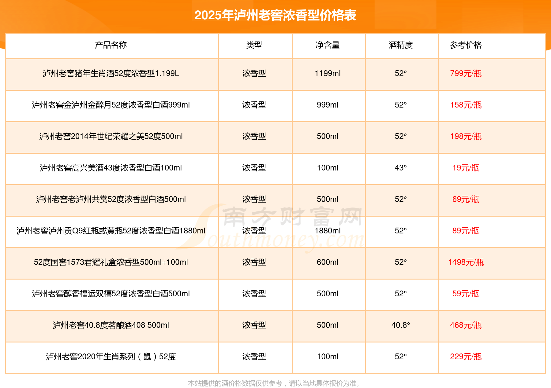 2025年,瀘州老窖濃香型酒價格最高的是瀘州老窖國窖1573春釀鼠兆豐年E 55度,參考價17999元,最低的是瀘州老窖45度五洲醉8窖經(jīng)典小酒版濃香型100ml,參考價10元,價格高低差為17989元。