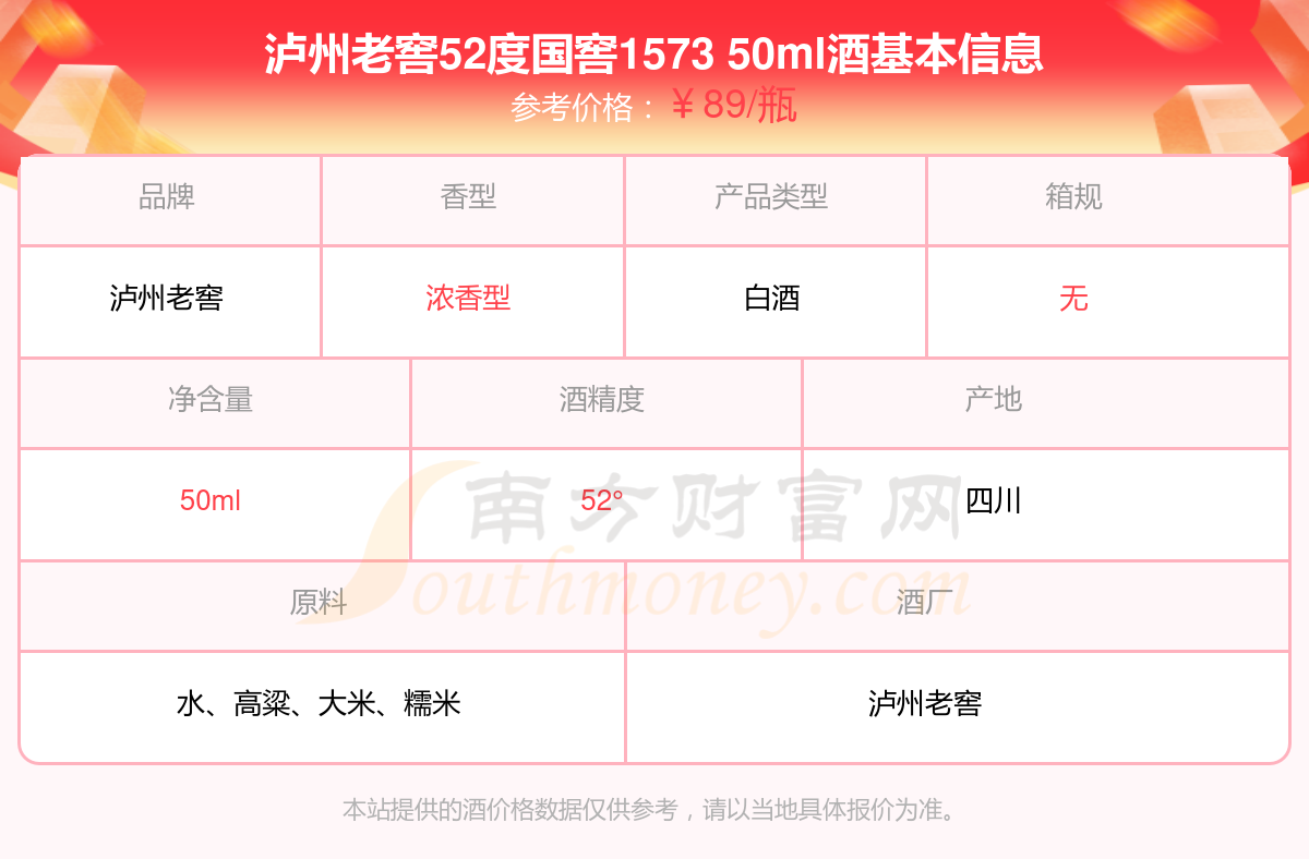 瀘州老窖52度國(guó)窖1573 50ml基本信息