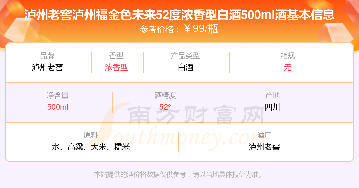 瀘州老窖瀘州福金色未來52度濃香型白酒500ml基本信息