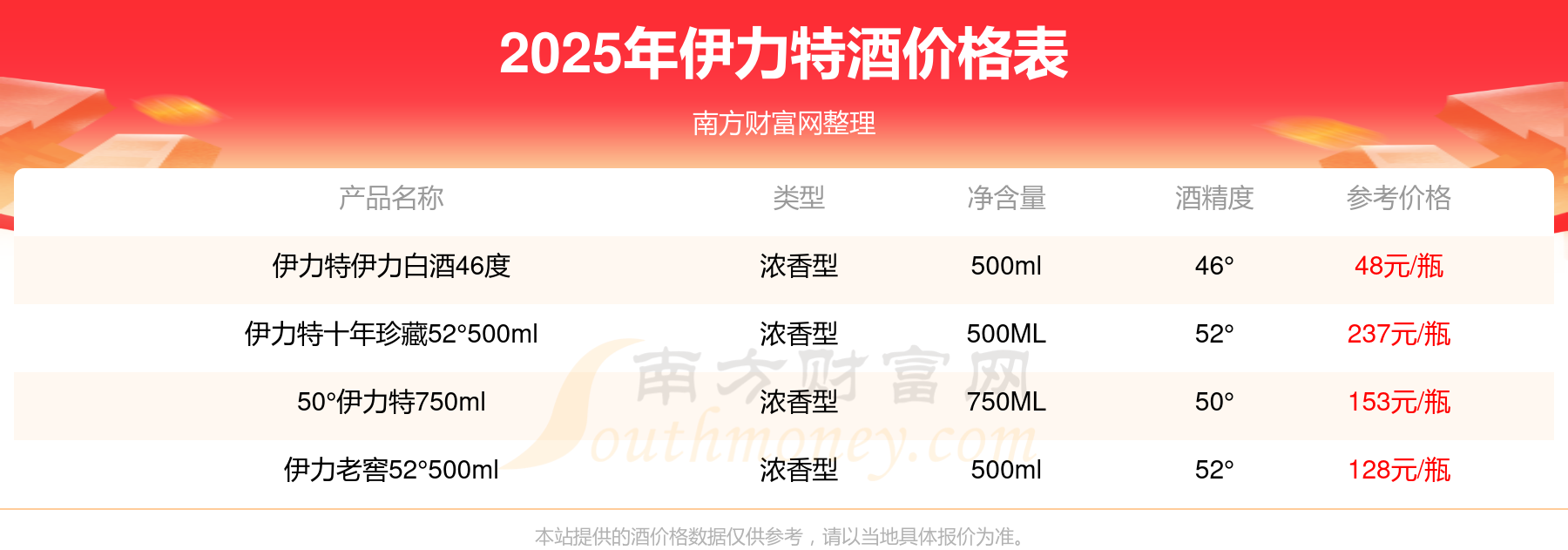 伊力特酒最新價格2025:伊力特十年珍藏52°500ml參考價237元/瓶、50°伊力特750ml參考價153元/瓶、伊力老窖52°500ml參考價128元/瓶、伊力特伊力白酒46度參考價48元/瓶。