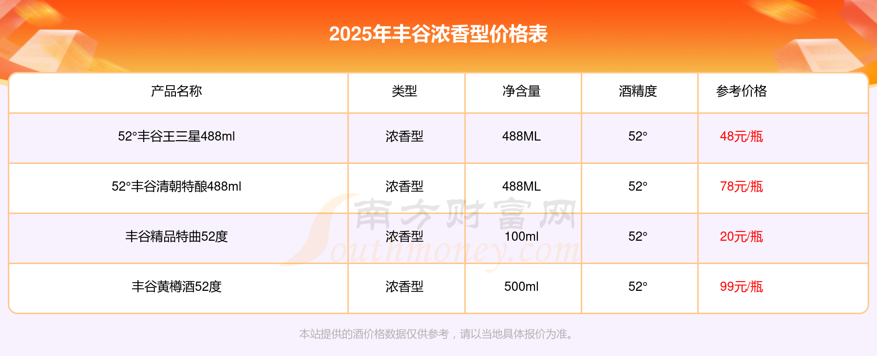 2025年豐谷濃香型酒豐谷黃樽酒52度、52°豐谷清朝特釀488ml、52°豐谷王三星488ml、豐谷精品特曲52度等最新價格如下:豐谷黃樽酒52度參考價99元/瓶、52°豐谷清朝特釀488ml參考價78元/瓶、52°豐谷王三星488ml參考價48元/瓶、豐谷精品特曲52度參考價20元/瓶。