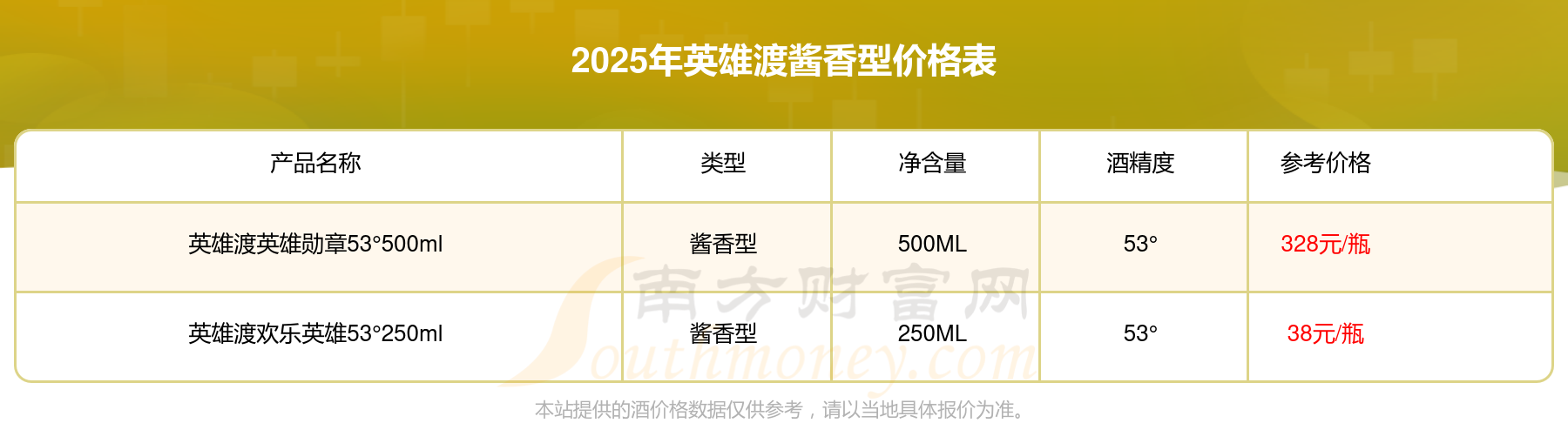 2025年英雄渡醬香型酒英雄渡英雄勛章53°500ml、英雄渡歡樂英雄53°250ml等最新價格如下:英雄渡英雄勛章53°500ml參考價328元/瓶、英雄渡歡樂英雄53°250ml參考價38元/瓶。