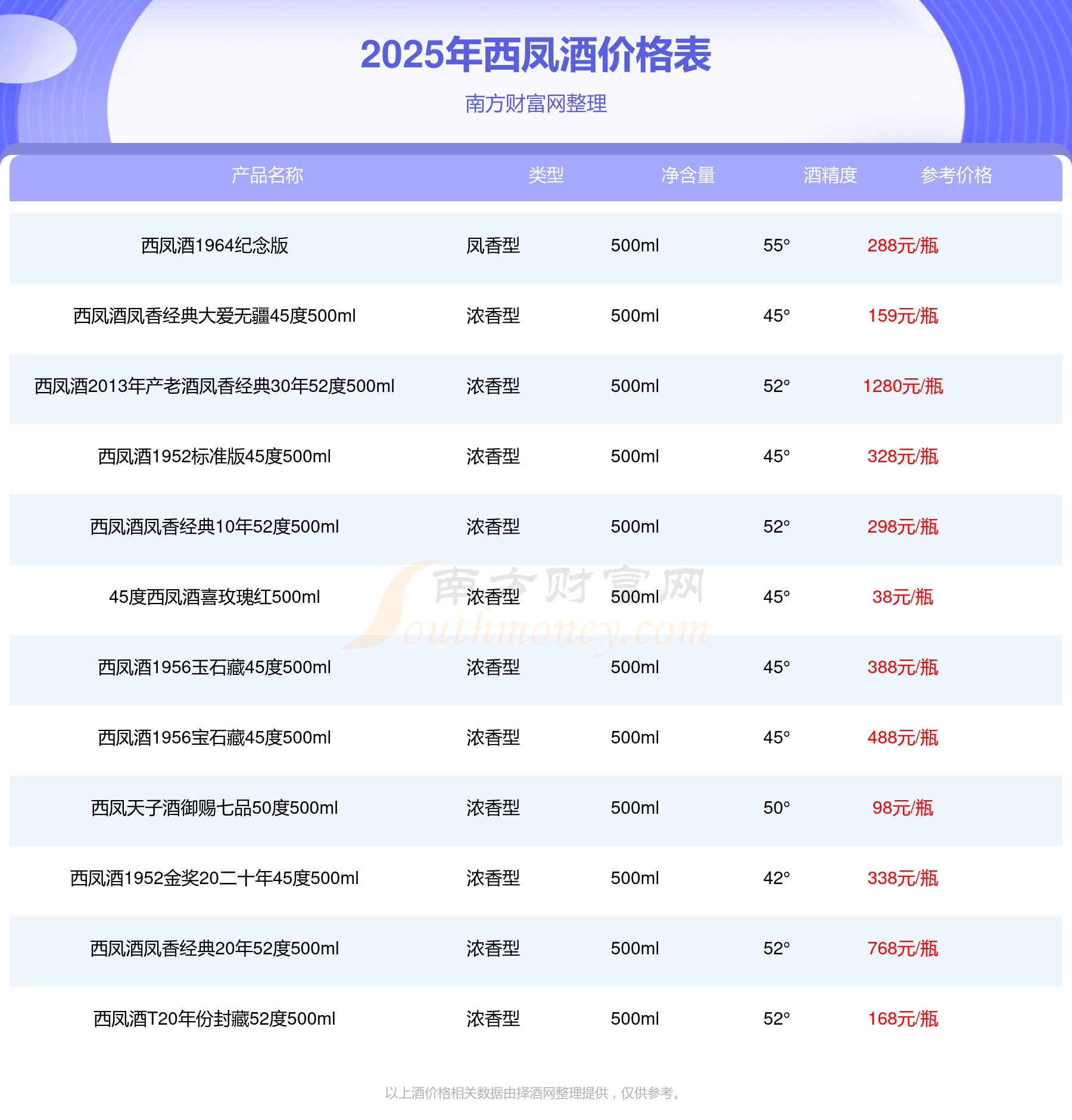 2025年,西鳳酒 酒海私藏55度3000ml、西鳳酒1952金獎(jiǎng)50 55度500ml、西鳳酒2013年產(chǎn)老酒鳳香經(jīng)典30年52度500ml、西鳳酒1956鉆石藏45度500ml、西鳳酒1952金獎(jiǎng)30 55度500ml、西鳳酒鳳香經(jīng)典20年52度500ml等西鳳酒價(jià)格如下:西鳳酒 酒海私藏55度3000ml參考價(jià)8880元/瓶、西鳳酒1952金獎(jiǎng)50 55度500ml參考價(jià)2380元/瓶、西鳳酒2013年產(chǎn)老酒鳳香經(jīng)典30年52度500ml參考價(jià)1280元/瓶、西鳳酒1956鉆石藏45度500ml參考價(jià)980元/瓶、西鳳酒1952金獎(jiǎng)30 55度500ml參考價(jià)898元/瓶、西鳳酒鳳香經(jīng)典20年52度500ml參考價(jià)768元/瓶。