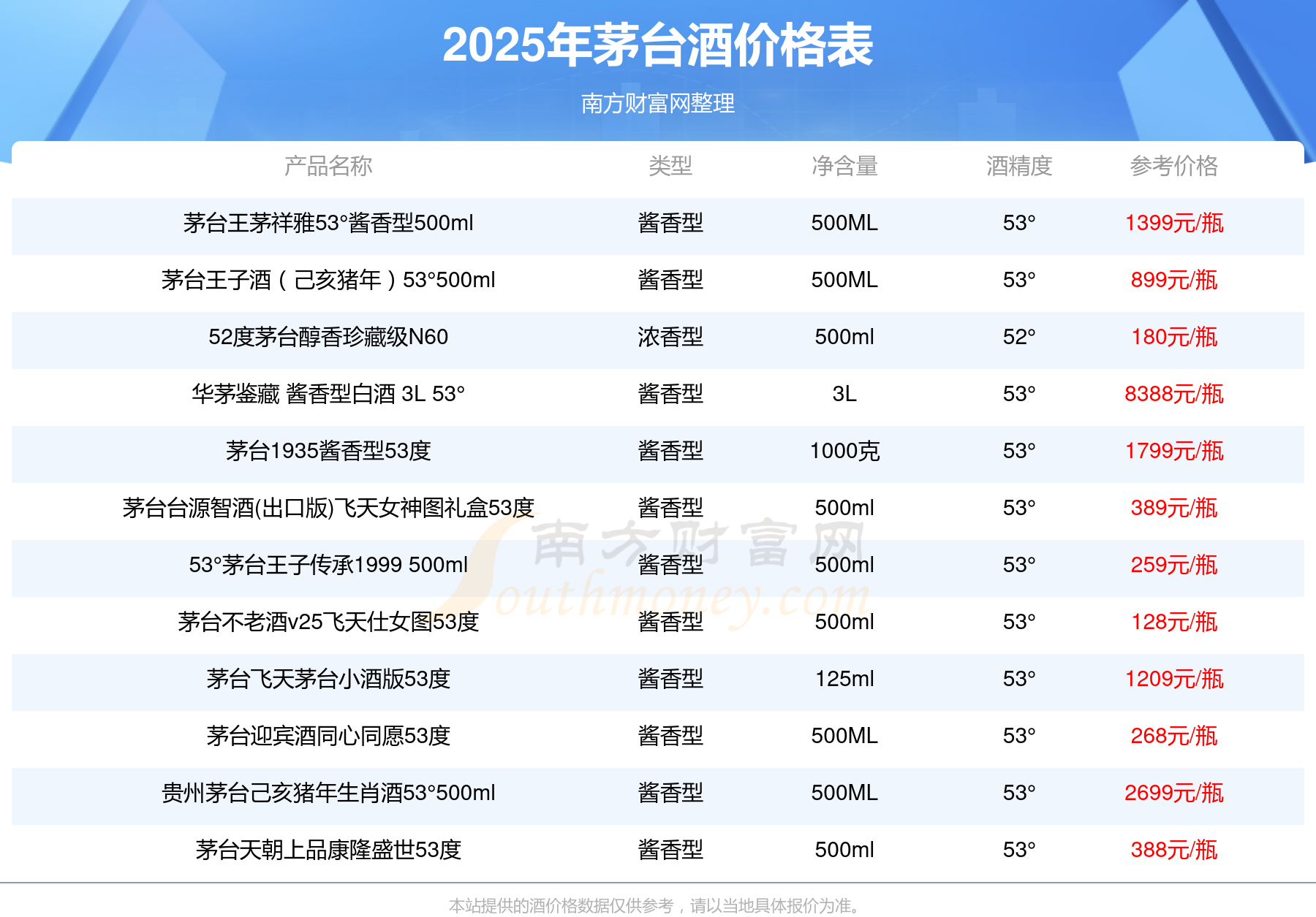 2025年,華茅鑒藏 醬香型白酒 3L 53°、53度五星茅臺生肖酒丁酉雞年、貴州茅臺己亥豬年生肖酒53°500ml、53度五星茅臺生肖酒戊戌狗年、飛天茅臺53°500ml(2015年)、茅臺王子酒己亥豬年生肖紀念酒53度2.5L、茅臺1935醬香型53度等茅臺酒參考價格如下:華茅鑒藏 醬香型白酒 3L 53°參考價8388元、53度五星茅臺生肖酒丁酉雞年參考價2798元、貴州茅臺己亥豬年生肖酒53°500ml參考價2699元、53度五星茅臺生肖酒戊戌狗年參考價2698元、飛天茅臺53°500ml(2015年)參考價2199元、茅臺王子酒己亥豬年生肖紀念酒53度2.5L參考價2099元、茅臺1935醬香型53度參考價1799元。