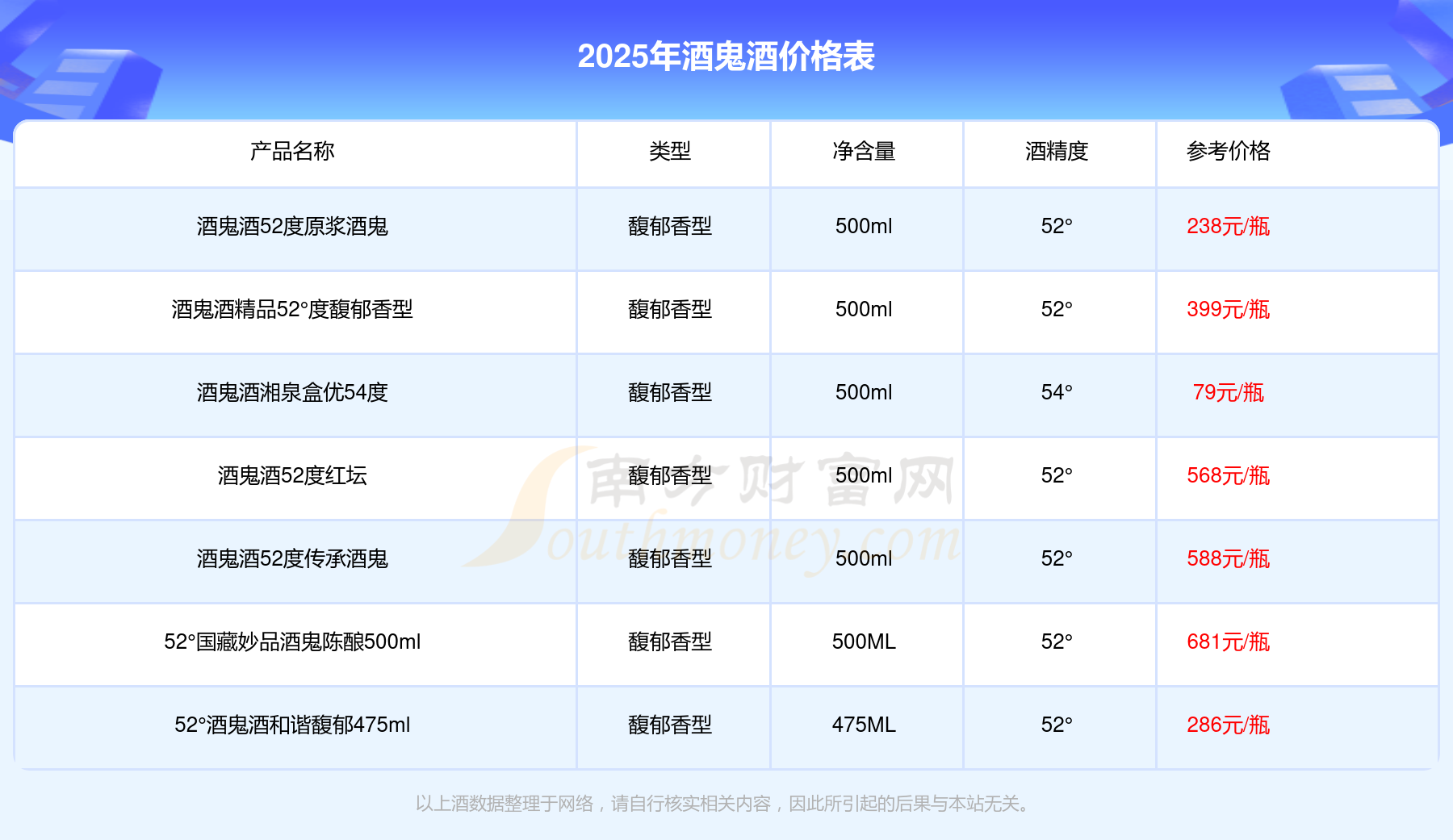 酒鬼酒最新價格2025:52°國藏妙品酒鬼陳釀500ml參考價681元/瓶、酒鬼酒52度傳承酒鬼參考價588元/瓶、酒鬼酒52度紅壇參考價568元/瓶、酒鬼酒精品52°度馥郁香型參考價399元/瓶、52°酒鬼酒和諧馥郁475ml參考價286元/瓶。