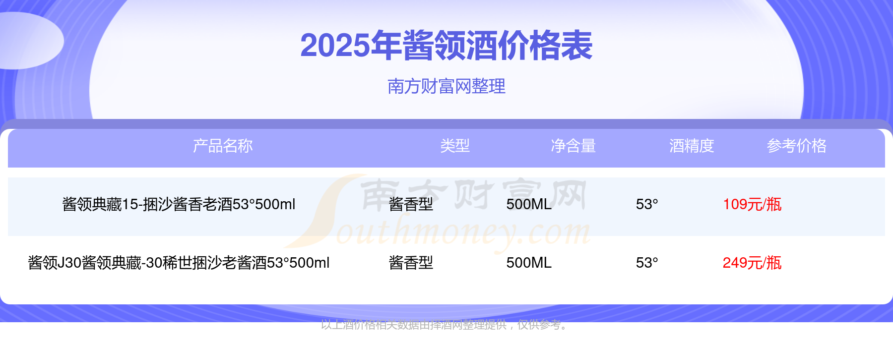 2025年醬領酒醬領J30醬領典藏-30稀世捆沙老醬酒53°500ml、醬領典藏15-捆沙醬香老酒53°500ml等最新價格如下: