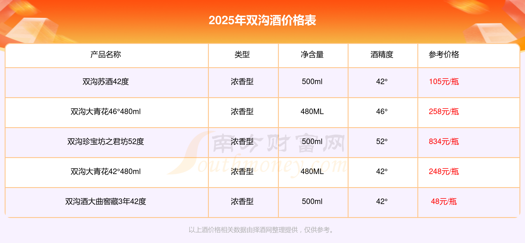 2025雙溝酒最新價格:雙溝珍寶坊之君坊52度參考價834元/瓶、雙溝大青花46°480ml參考價258元/瓶、雙溝大青花42°480ml參考價248元/瓶、雙溝蘇酒42度參考價105元/瓶、雙溝酒大曲窖藏3年42度參考價48元/瓶。