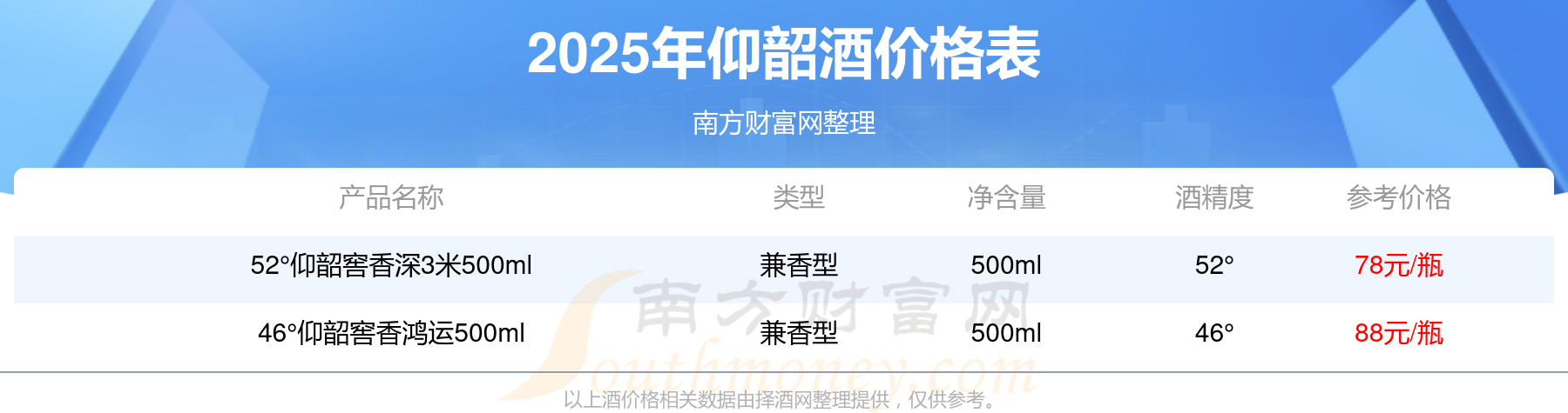 2025年,46°仰韶窖香鴻運(yùn)500ml、52°仰韶窖香深3米500ml等仰韶酒價(jià)格如下:46°仰韶窖香鴻運(yùn)500ml參考價(jià)88元/瓶、52°仰韶窖香深3米500ml參考價(jià)78元/瓶。