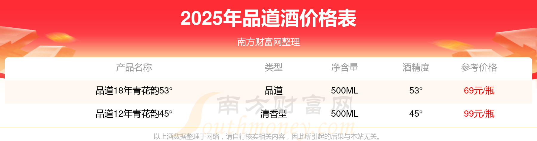 品道酒最新價(jià)格2025:品道12年青花韻45°參考價(jià)99元/瓶、品道18年青花韻53°參考價(jià)69元/瓶。