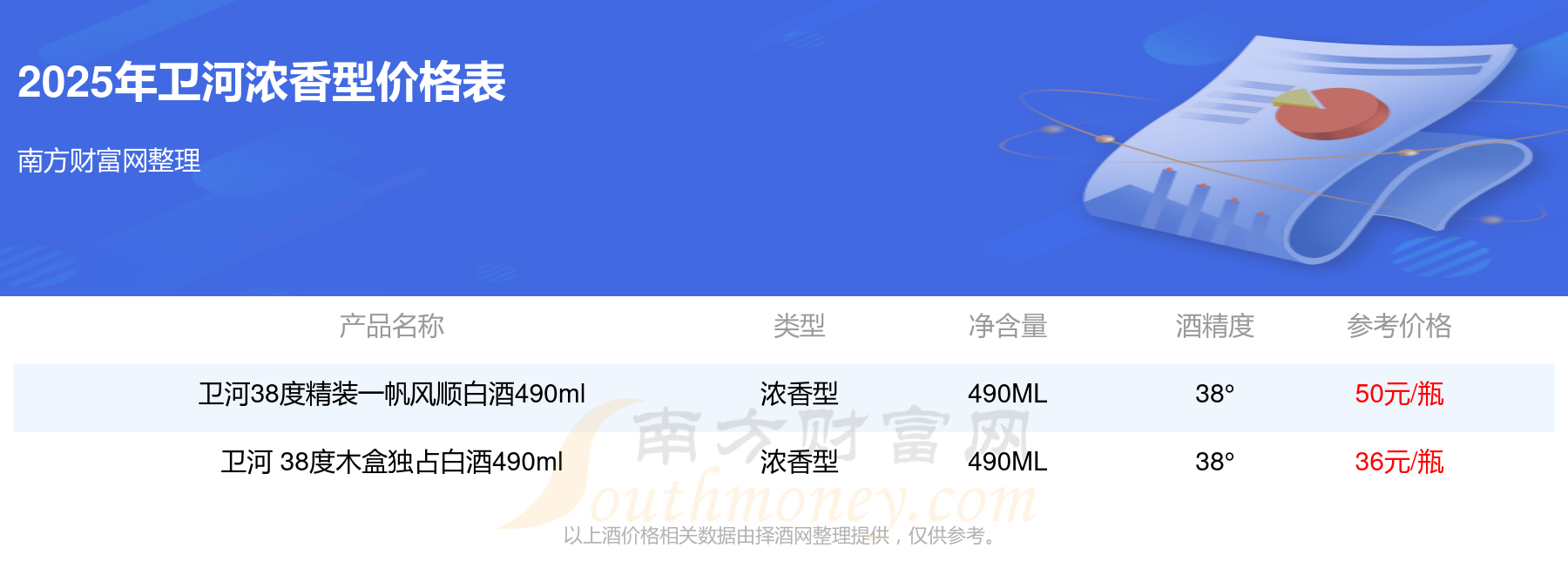 2025衛(wèi)河濃香型酒最新價格:衛(wèi)河38度精裝一帆風(fēng)順白酒490ml參考價50元/瓶、衛(wèi)河 38度木盒獨占白酒490ml參考價36元/瓶。