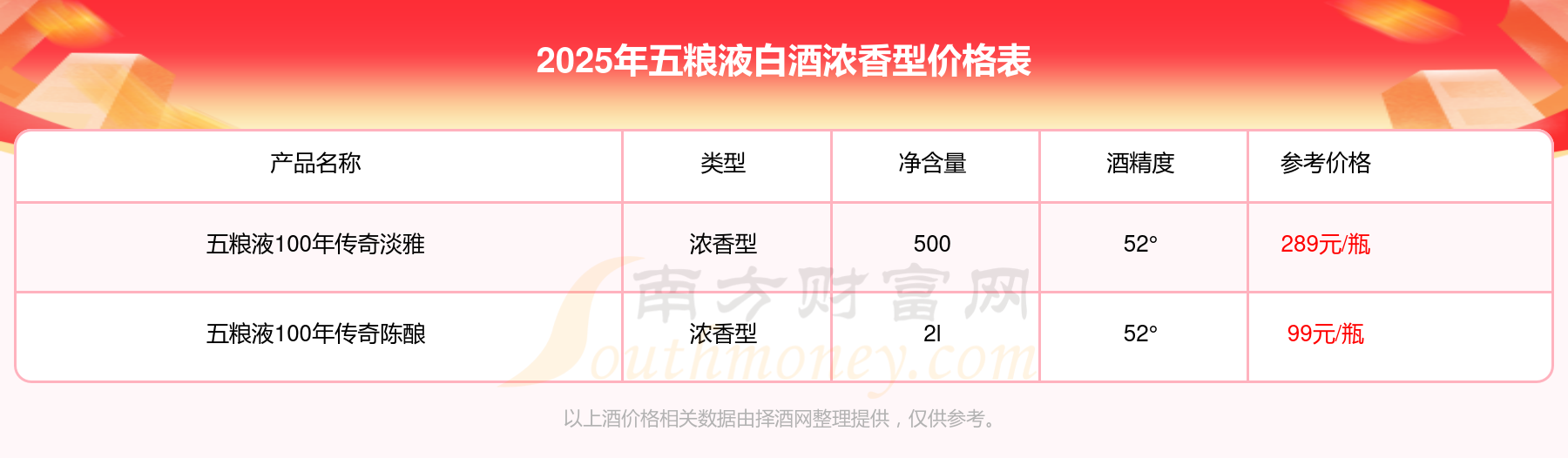 2025年,五糧液100年傳奇淡雅、五糧液100年傳奇陳釀等五糧液白酒濃香型酒價(jià)格如下:五糧液100年傳奇淡雅參考價(jià)289元/瓶、五糧液100年傳奇陳釀參考價(jià)99元/瓶。