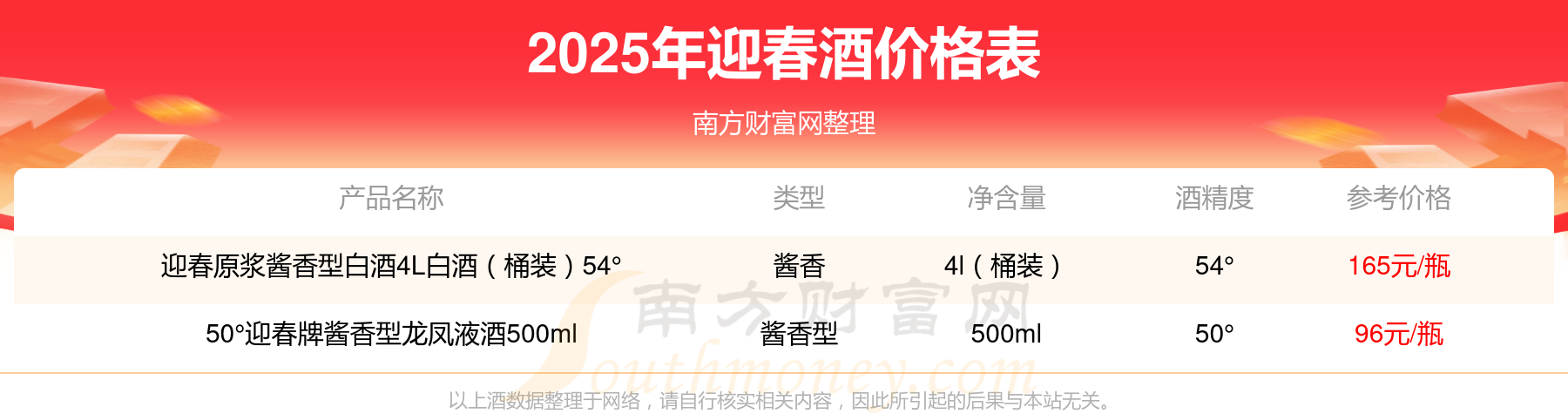 2025年迎春酒迎春原漿醬香型白酒4L白酒(桶裝)54°、50°迎春牌醬香型龍鳳液酒500ml等最新價(jià)格如下:迎春原漿醬香型白酒4L白酒(桶裝)54°參考價(jià)165元/瓶、50°迎春牌醬香型龍鳳液酒500ml參考價(jià)96元/瓶。