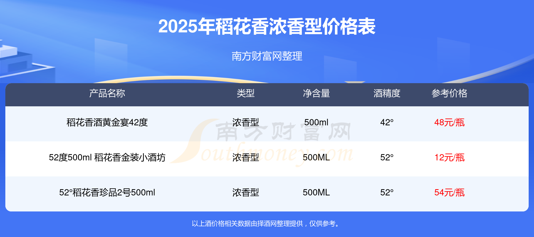 2025稻花香濃香型酒最新價格:52°稻花香珍品2號500ml參考價54元/瓶、稻花香酒黃金宴42度參考價48元/瓶、52度500ml 稻花香金裝小酒坊參考價12元/瓶。