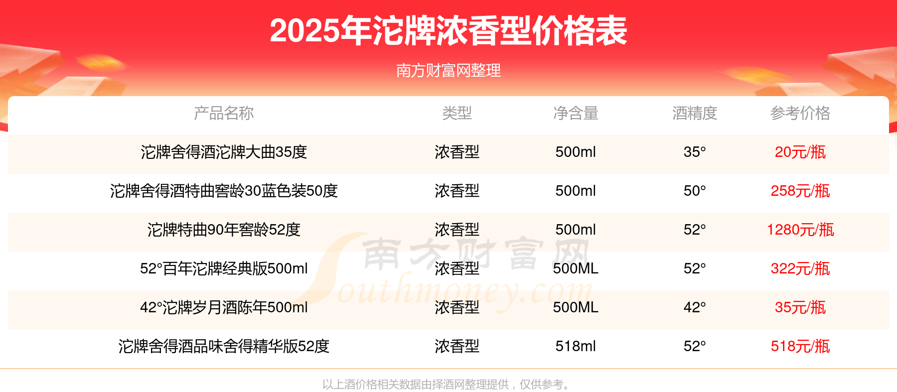 2025年,沱牌濃香型酒價格最高的是沱牌特曲90年窖齡52度,參考價1280元,最低的是沱牌舍得酒沱牌大曲35度,參考價20元,價格高低差為1260元。