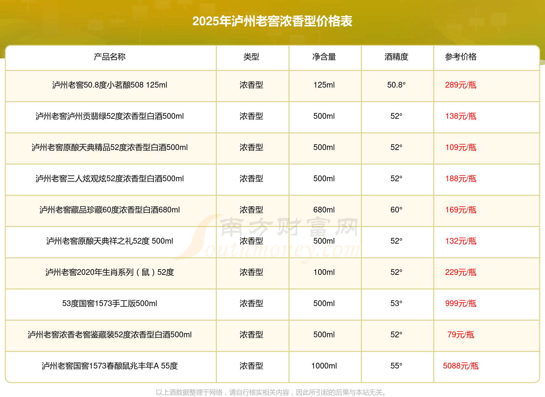 2025年,瀘州老窖國(guó)窖1573春釀鼠兆豐年E 55度、瀘州老窖國(guó)窖1573生命中的那壇酒55度014、瀘州老窖國(guó)窖1573春釀鼠兆豐年A 55度等瀘州老窖濃香型酒價(jià)格如下: