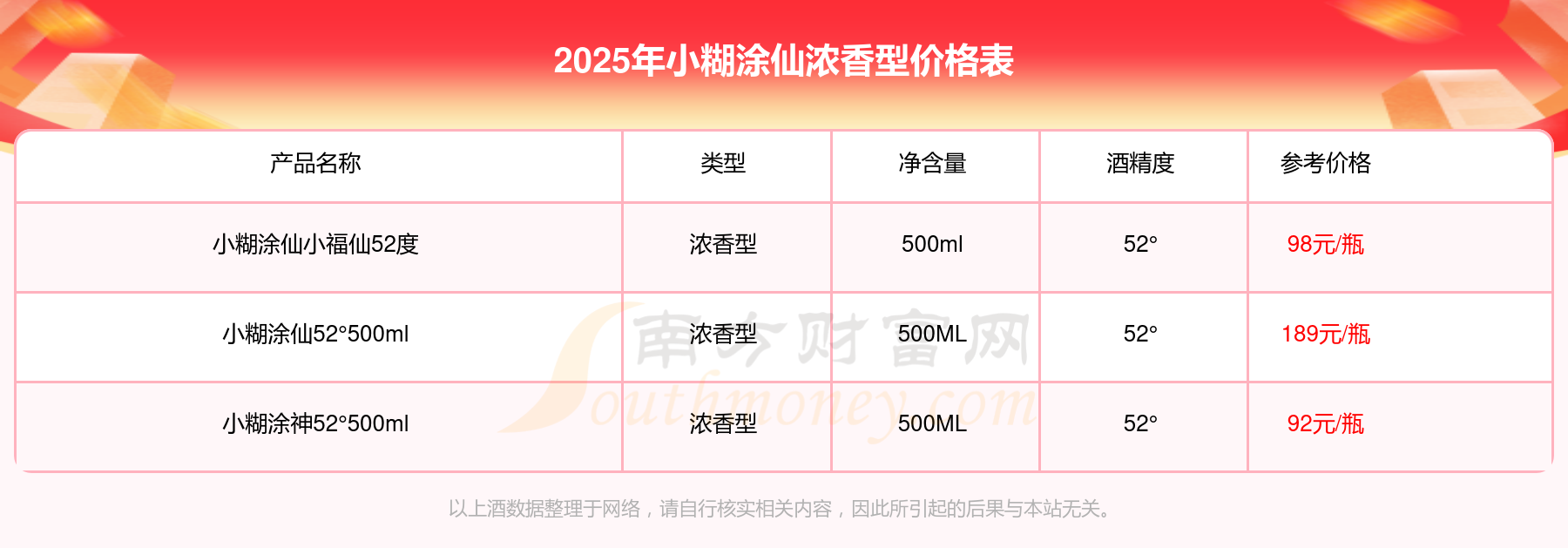 2025年,小糊涂仙52°500ml、小糊涂仙小福仙52度、小糊涂神52°500ml等小糊涂仙濃香型酒價(jià)格如下:小糊涂仙52°500ml參考價(jià)189元/瓶、小糊涂仙小福仙52度參考價(jià)98元/瓶、小糊涂神52°500ml參考價(jià)92元/瓶。
