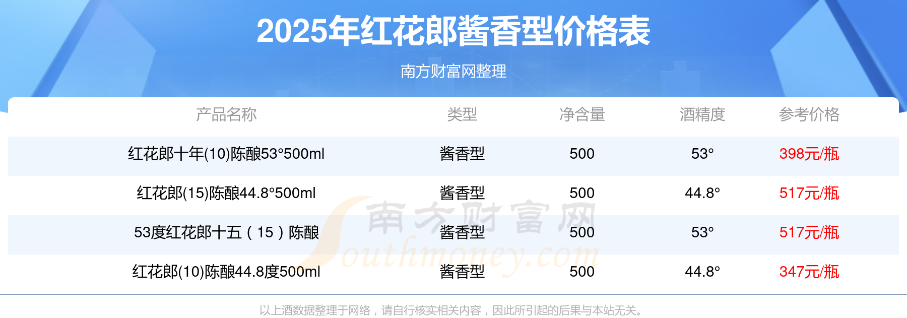紅花郎醬香型酒最新價(jià)格2025:53度紅花郎十五(15)陳釀參考價(jià)517元/瓶、紅花郎(15)陳釀44.8°500ml參考價(jià)517元/瓶、紅花郎十年(10)陳釀53°500ml參考價(jià)398元/瓶、紅花郎(10)陳釀44.8度500ml參考價(jià)347元/瓶。