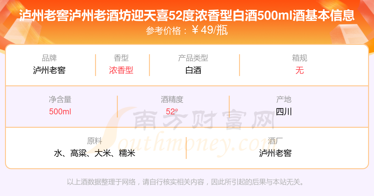 瀘州老窖瀘州老酒坊迎天喜52度濃香型白酒500ml基本信息