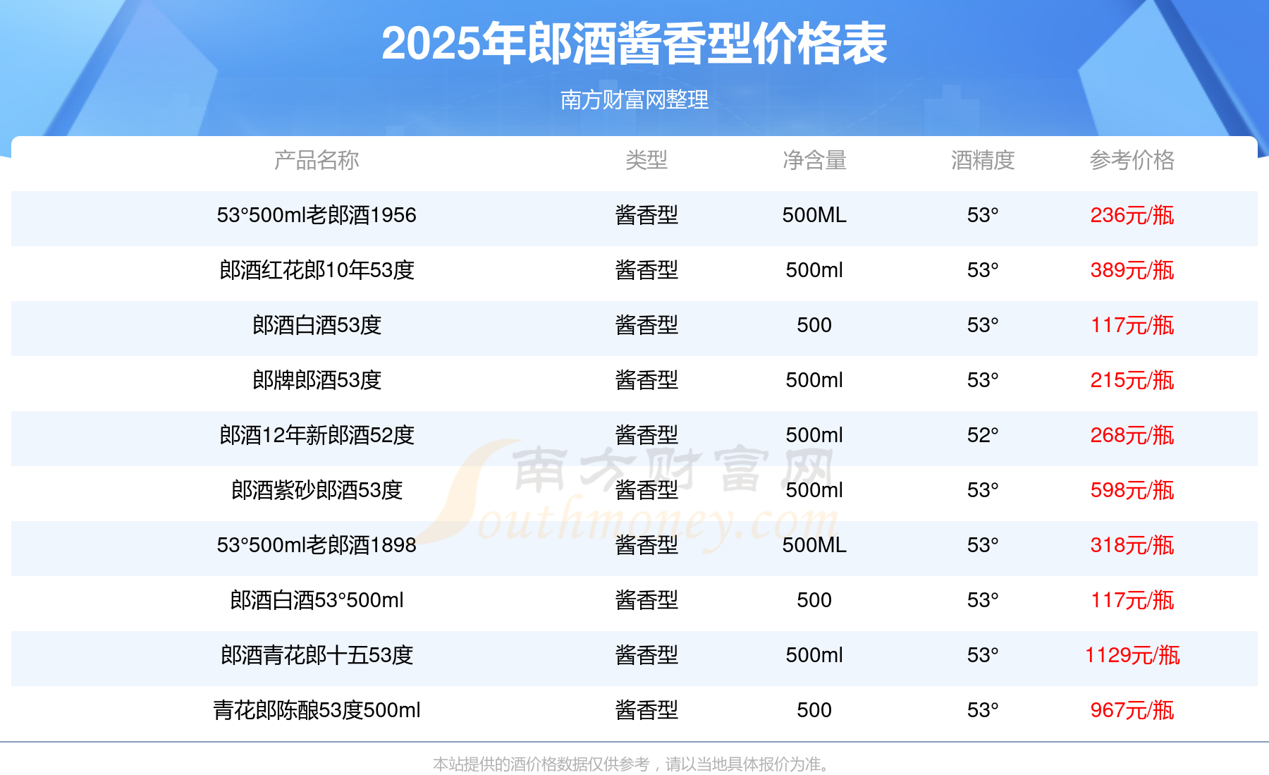 2025年,郎酒青花郎十五53度、青花郎陳釀53度500ml、郎酒紫砂郎酒53度、郎酒紅花郎10年53度、53°500ml老郎酒1898、郎酒12年新郎酒52度、53°500ml老郎酒1956、郎牌郎酒53度等郎酒醬香型酒價(jià)格如下:郎酒青花郎十五53度參考價(jià)1129元/瓶、青花郎陳釀53度500ml參考價(jià)967元/瓶、郎酒紫砂郎酒53度參考價(jià)598元/瓶、郎酒紅花郎10年53度參考價(jià)389元/瓶、53°500ml老郎酒1898參考價(jià)318元/瓶、郎酒12年新郎酒52度參考價(jià)268元/瓶、53°500ml老郎酒1956參考價(jià)236元/瓶、郎牌郎酒53度參考價(jià)215元/瓶。
