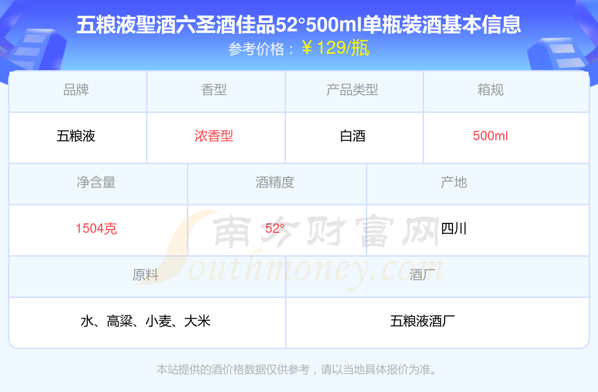 五糧液聖酒六圣酒佳品52°500ml單瓶裝基本信息