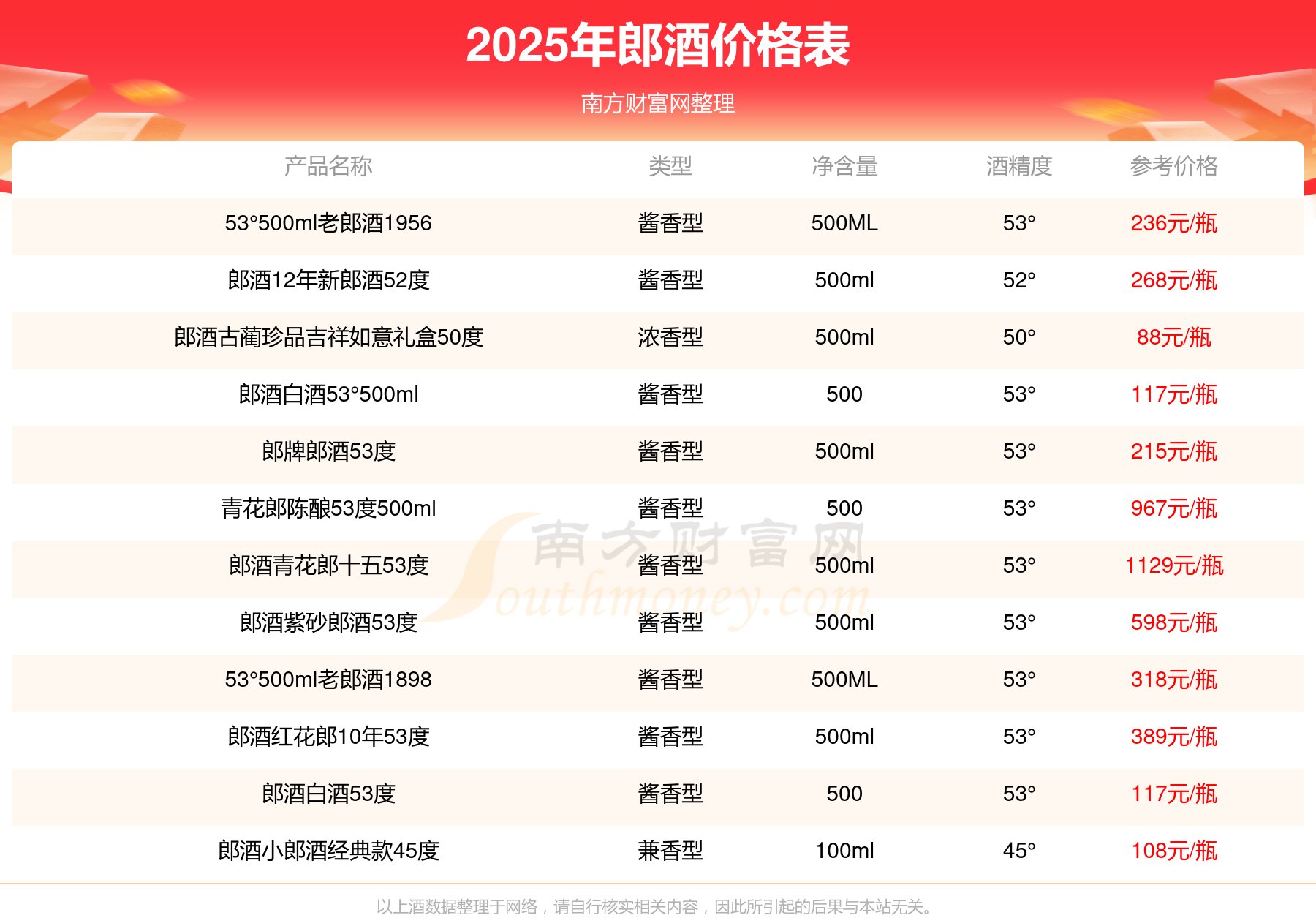2025年,郎酒青花郎十五53度、青花郎陳釀53度500ml、郎酒紫砂郎酒53度、郎酒紅花郎10年53度、53°500ml老郎酒1898、郎酒12年新郎酒52度等郎酒價格如下:郎酒青花郎十五53度參考價1129元/瓶、青花郎陳釀53度500ml參考價967元/瓶、郎酒紫砂郎酒53度參考價598元/瓶、郎酒紅花郎10年53度參考價389元/瓶、53°500ml老郎酒1898參考價318元/瓶、郎酒12年新郎酒52度參考價268元/瓶。