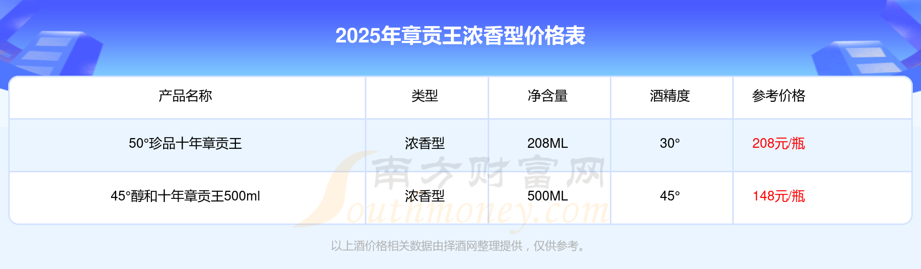 2025年,50°珍品十年章貢王、45°醇和十年章貢王500ml等章貢王濃香型酒價(jià)格如下:50°珍品十年章貢王參考價(jià)208元/瓶、45°醇和十年章貢王500ml參考價(jià)148元/瓶。