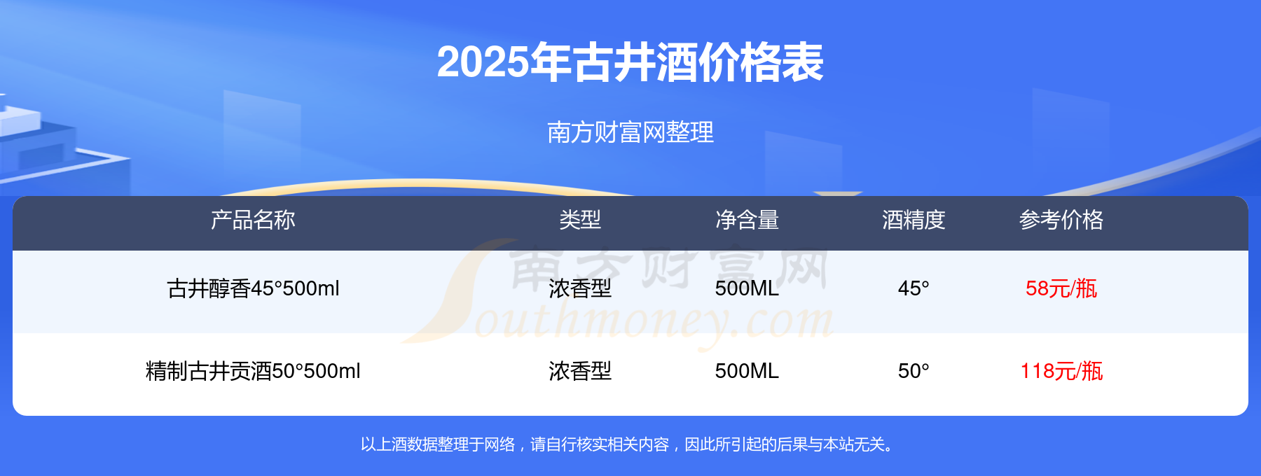 2025年古井酒精制古井貢酒50°500ml、古井醇香45°500ml等最新價格如下:精制古井貢酒50°500ml參考價118元/瓶、古井醇香45°500ml參考價58元/瓶。