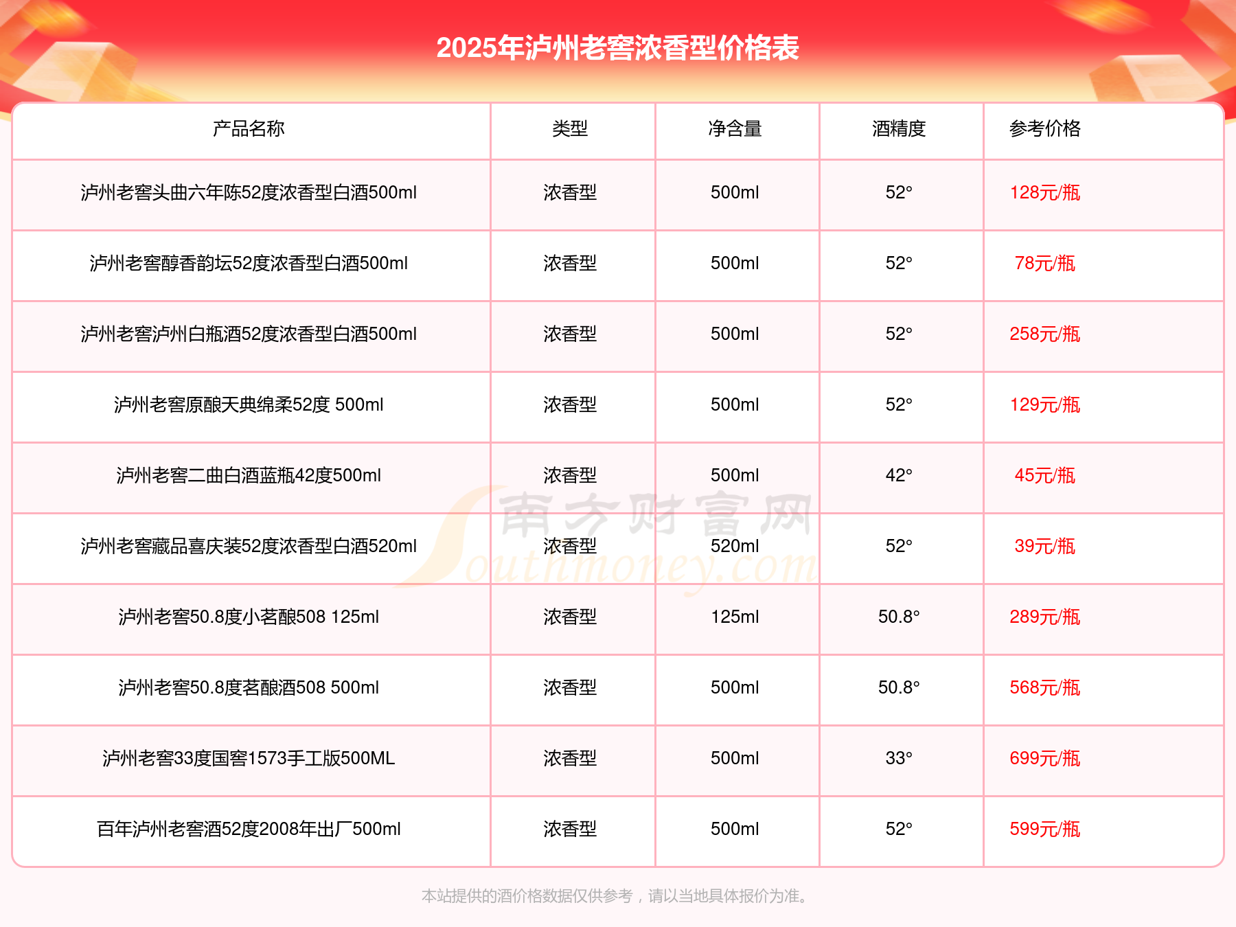 瀘州老窖國窖1573春釀鼠兆豐年E 55度參考價17999元/瓶、瀘州老窖國窖1573生命中的那壇酒55度014參考價9999元/瓶、瀘州老窖國窖1573春釀鼠兆豐年A 55度參考價5088元/瓶、瀘州老窖國窖1573生命中的那壇酒55度013濃香型白酒1000ml參考價4988元/瓶、瀘州老窖國窖1573生命中的那壇酒55度009 1000ml參考價4288元/瓶、瀘州老窖國窖1573中國品味52度濃香型白酒500ml參考價2888元/瓶、瀘州老窖國窖1573許燎源概念作品58度濃香型白酒1000ml參考價2680元/瓶。