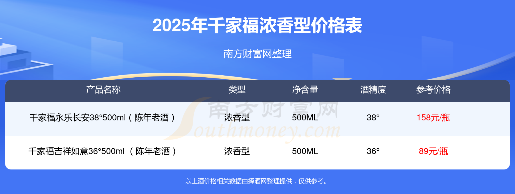 2025年,千家福永樂長(zhǎng)安38°500ml(陳年老酒)、千家福吉祥如意36°500ml (陳年老酒)等千家福濃香型酒價(jià)格如下:千家福永樂長(zhǎng)安38°500ml(陳年老酒)參考價(jià)158元/瓶、千家福吉祥如意36°500ml (陳年老酒)參考價(jià)89元/瓶。