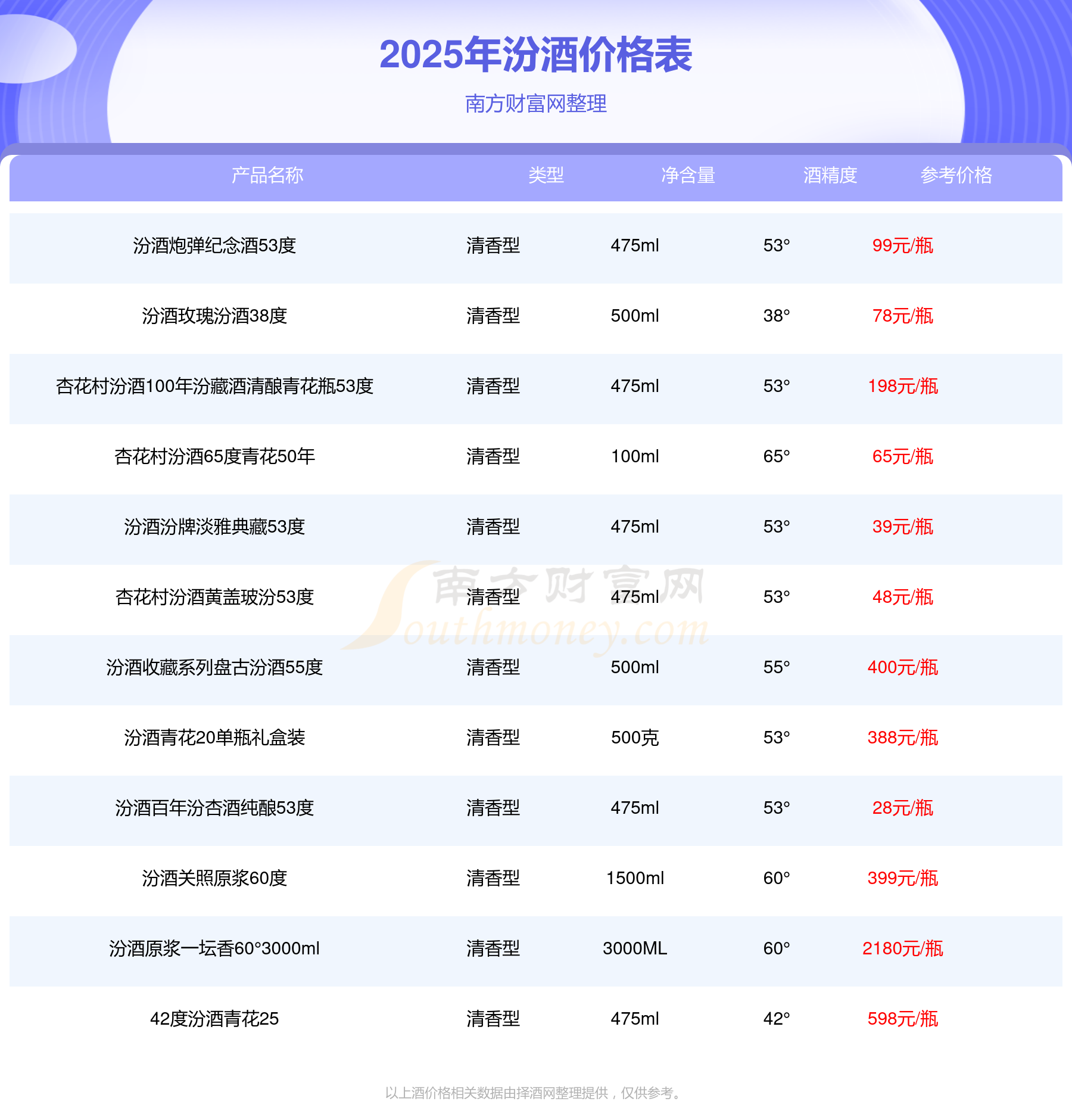 2025年,汾酒原漿一壇香60°3000ml、汾酒原漿一壇香60°1500ml、42度汾酒青花25、汾酒收藏系列盤古汾酒55度等汾酒價(jià)格如下: