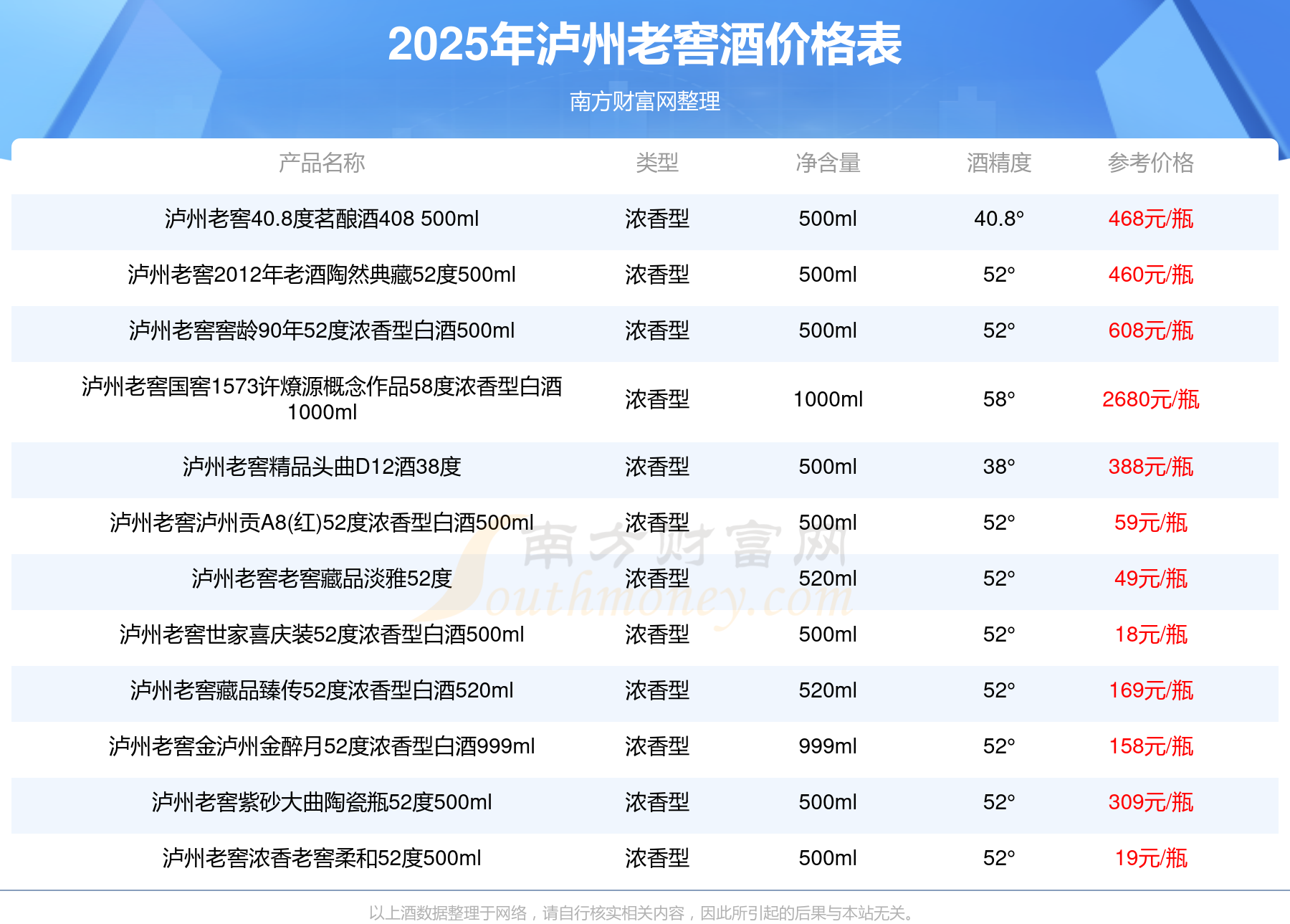 2025年,瀘州老窖國窖1573春釀鼠兆豐年E 55度、瀘州老窖國窖1573生命中的那壇酒55度014、瀘州老窖國窖1573春釀鼠兆豐年A 55度、瀘州老窖國窖1573生命中的那壇酒55度013濃香型白酒1000ml等瀘州老窖酒價格如下:瀘州老窖國窖1573春釀鼠兆豐年E 55度參考價17999元/瓶、瀘州老窖國窖1573生命中的那壇酒55度014參考價9999元/瓶、瀘州老窖國窖1573春釀鼠兆豐年A 55度參考價5088元/瓶、瀘州老窖國窖1573生命中的那壇酒55度013濃香型白酒1000ml參考價4988元/瓶。