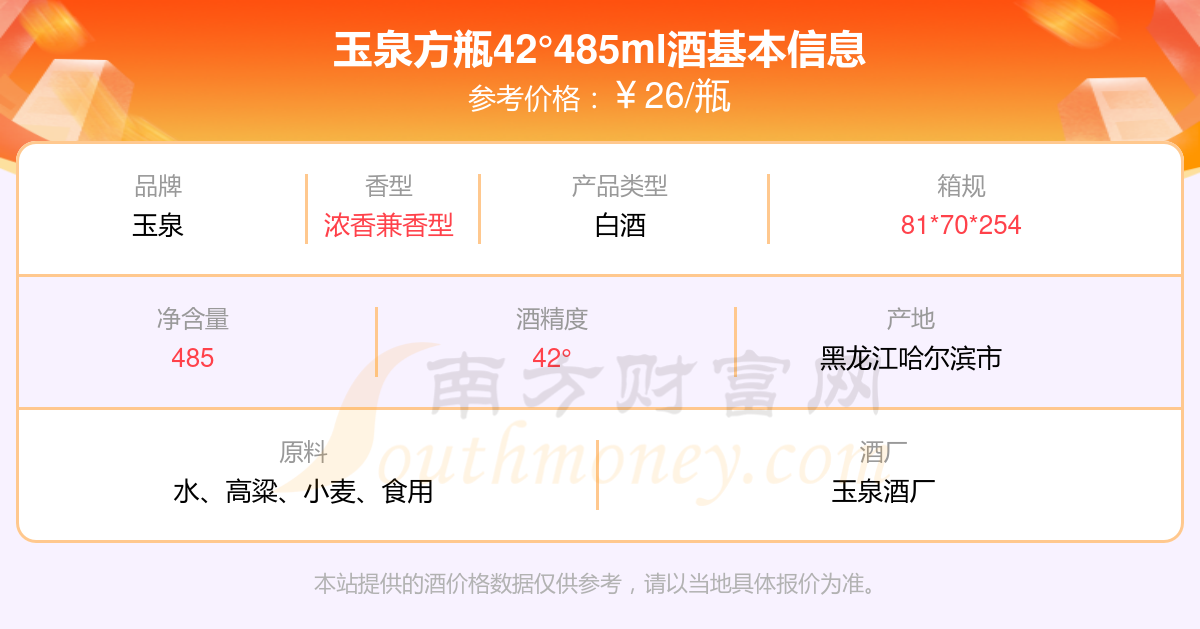 玉泉方瓶42°485ml基本信息