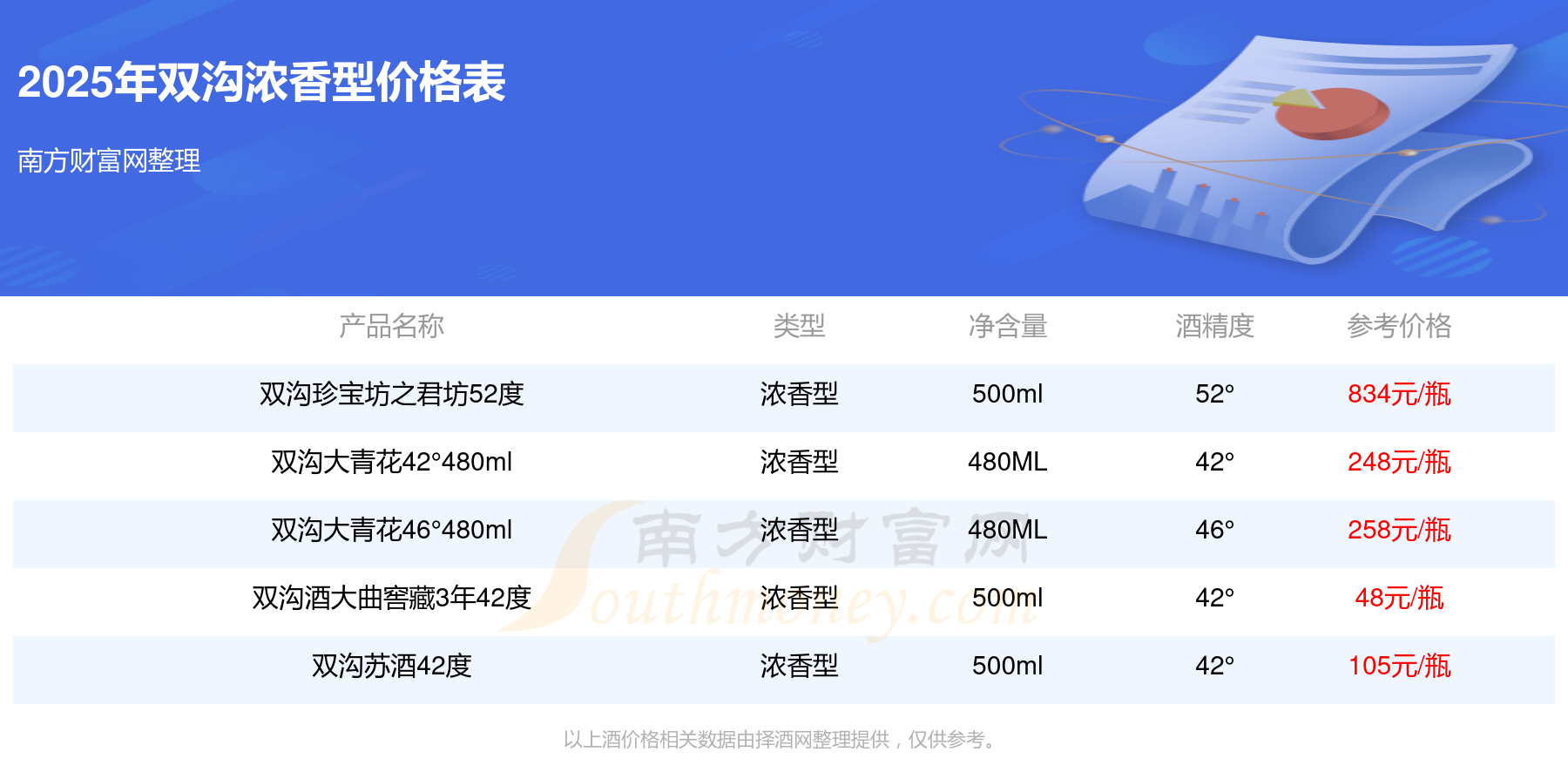 2025年雙溝濃香型價(jià)格最高的酒是雙溝珍寶坊之君坊52度,參考價(jià)834元/瓶,最低的是雙溝酒大曲窖藏3年42度,參考價(jià)48元/瓶,價(jià)格高低差為786元/瓶。