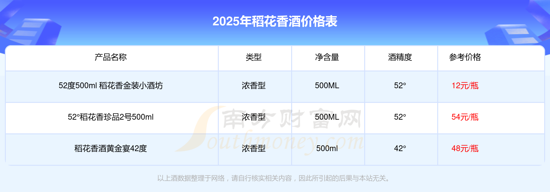 52°稻花香珍品2號500ml參考價54元/瓶、稻花香酒黃金宴42度參考價48元/瓶、52度500ml 稻花香金裝小酒坊參考價12元/瓶。
