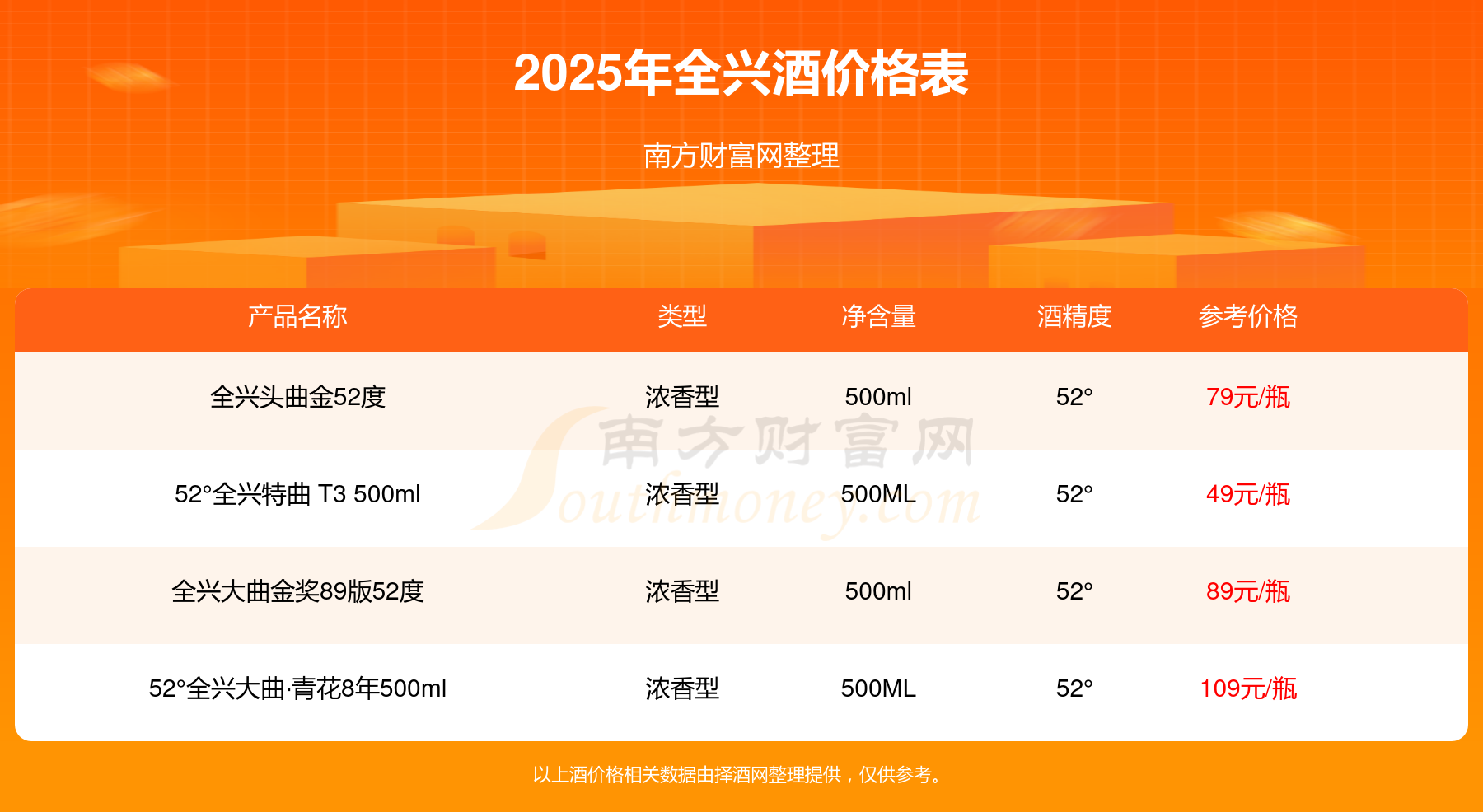 2025全興酒最新價格:52°全興大曲·青花8年500ml參考價109元/瓶、全興大曲金獎89版52度參考價89元/瓶、全興頭曲金52度參考價79元/瓶。