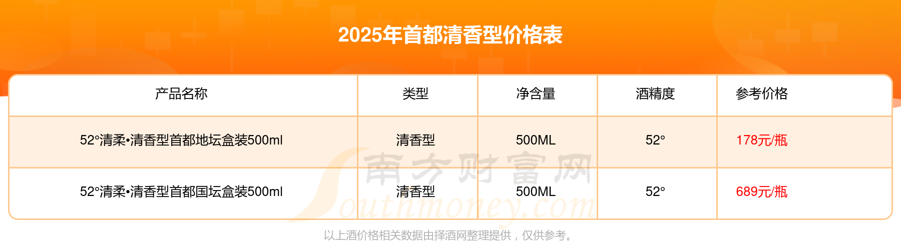 2025年首都清香型酒52°清柔?清香型首都國壇盒裝500ml、52°清柔?清香型首都地壇盒裝500ml等最新價格如下: