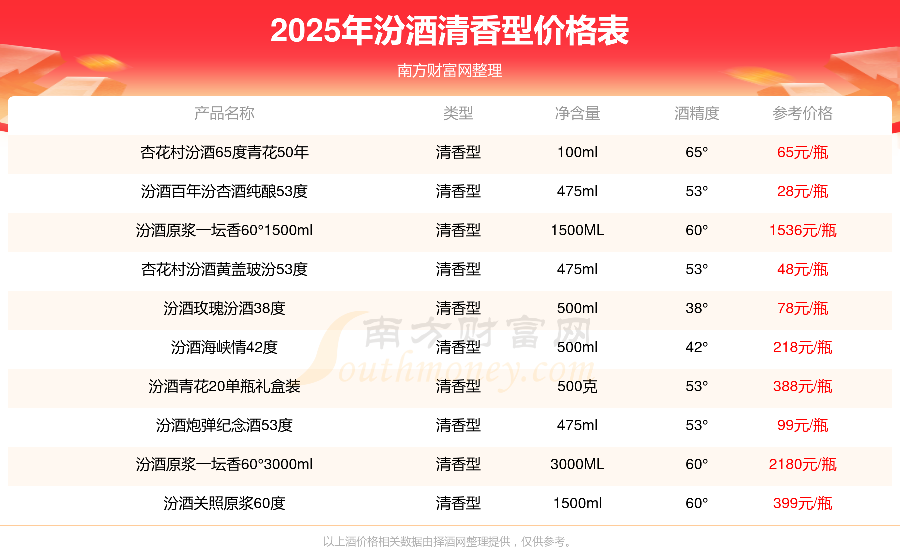 2025年,汾酒清香型酒價(jià)格最高的是汾酒原漿一壇香60°3000ml,參考價(jià)2180元,最低的是汾酒百年汾杏酒純釀53度,參考價(jià)28元,價(jià)格高低差為2152元。