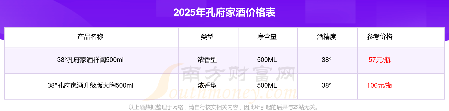 38°孔府家酒升級(jí)版大陶500ml參考價(jià)106元/瓶、38°孔府家酒祥闔500ml參考價(jià)57元/瓶。