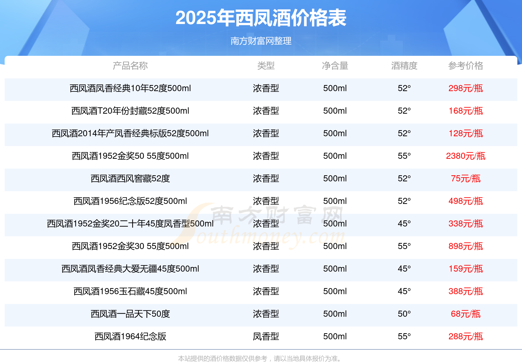 西鳳酒 酒海私藏55度3000ml參考價8880元/瓶、西鳳酒1952金獎50 55度500ml參考價2380元/瓶、西鳳酒2013年產(chǎn)老酒鳳香經(jīng)典30年52度500ml參考價1280元/瓶、西鳳酒1956鉆石藏45度500ml參考價980元/瓶。